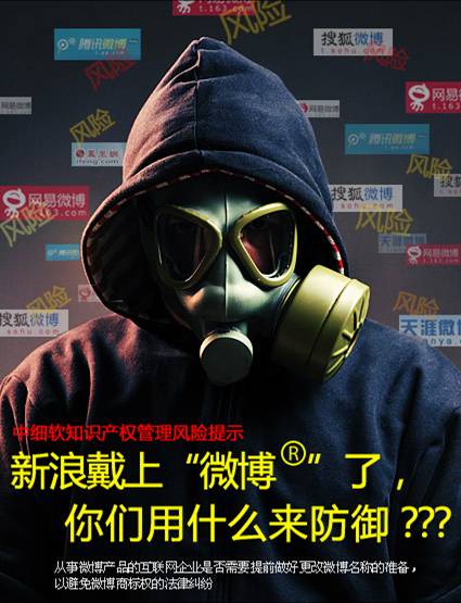 关于使用微博名称风险预警报告概述:2011年3月,中细软网络科技有限公司旗下的“细软知识产权管理软件—商标监控工具”对2010年中国互联网企业注册商标名称进行风险监控,发现新浪网技术(中国)有限公司已经拿到“微博”、“围脖”、“新浪微博”三个商标权。再使用微博名称的第三方互联网企业存在以下三 种风险: