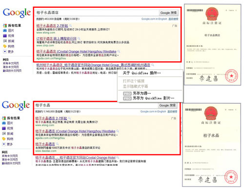 陈中在微博上透露,在Google搜索框中输入“桔子水晶”或“桔子水晶酒店”,点击搜索后显示的搜索页中,所弹出的搜索信息多为未经授权广告,而桔子酒店官方与谷歌沟通多次均无功而返,目前,桔子酒店已就侵权做出公证并将于近日起诉。