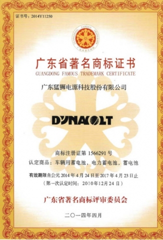 根据《广东省著名商标认定和管理规定》和《广东省著名商标评审委员会关于广东省著名商标认定和管理的实施细则》的规定,经广东省著名商标评审委员会评审和公示,延续认定广东猛狮电源科技股份有限公司(以下简称猛狮科技)的“DYNAVOLT”商标为广东省著名商标,有效期限自公元2014年4月24日至2017年4月23日止。